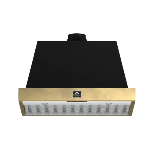 Forno Vittorio 36-Inch Wall Mount Range Hood, Black with Antique Brass Trim, 600 CFM Airflow, Dishwasher-Safe Baffle Filters, Remote Control, 3-Speed Fan, Bright LED Lighting.